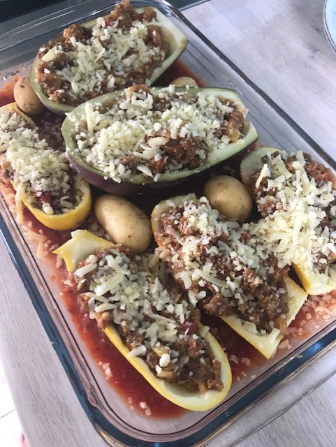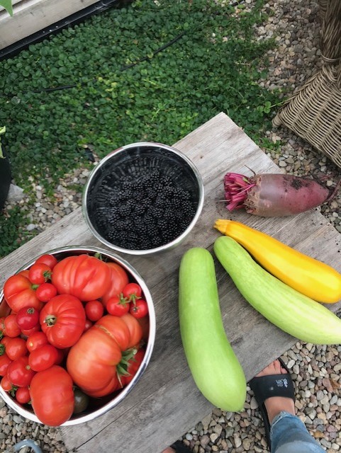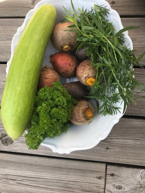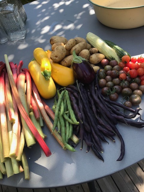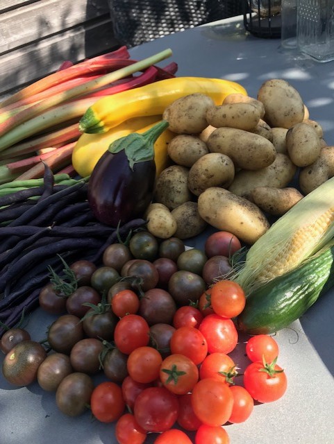 I utbyte har jag under tre månaders tid och typ var fjärde dag kunnat plocka till mig: gurka, potatis, lök, aubergine, tomater, zuccini, broccoli, majs, mangold, spenat, kål, och rödbetor. Lyckoträffen i år var en högväxande lila störböna och broccoli.
