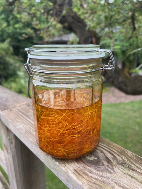 …väntar aldrig för länge. Men när det gäller att vänta på bloggar och ringblomsolja så kan det upplevas som en evig längtan. Idag sätter jag säsongens allra första olja och skickar er ett rykande färskt inlägg. Bladen har fått torka i en veckas tid och nu står burken färdigpreppad tillsammans med den kallpressade rapsoljan. Drygt tre veckor av längtan krävs för att oljan ska kunna dra till sig de fantastiska egenskaperna som ringblommorna har i sig. Efter det får du en olja som är läkande, avgiftande och antiseptisk. När den senare blandas med bivax ökar chansen till att få en ren produkt som lindrar och läker eksem och vårdar skadad hud. Många i min familj älskar den lika mycket som de älskar mig.